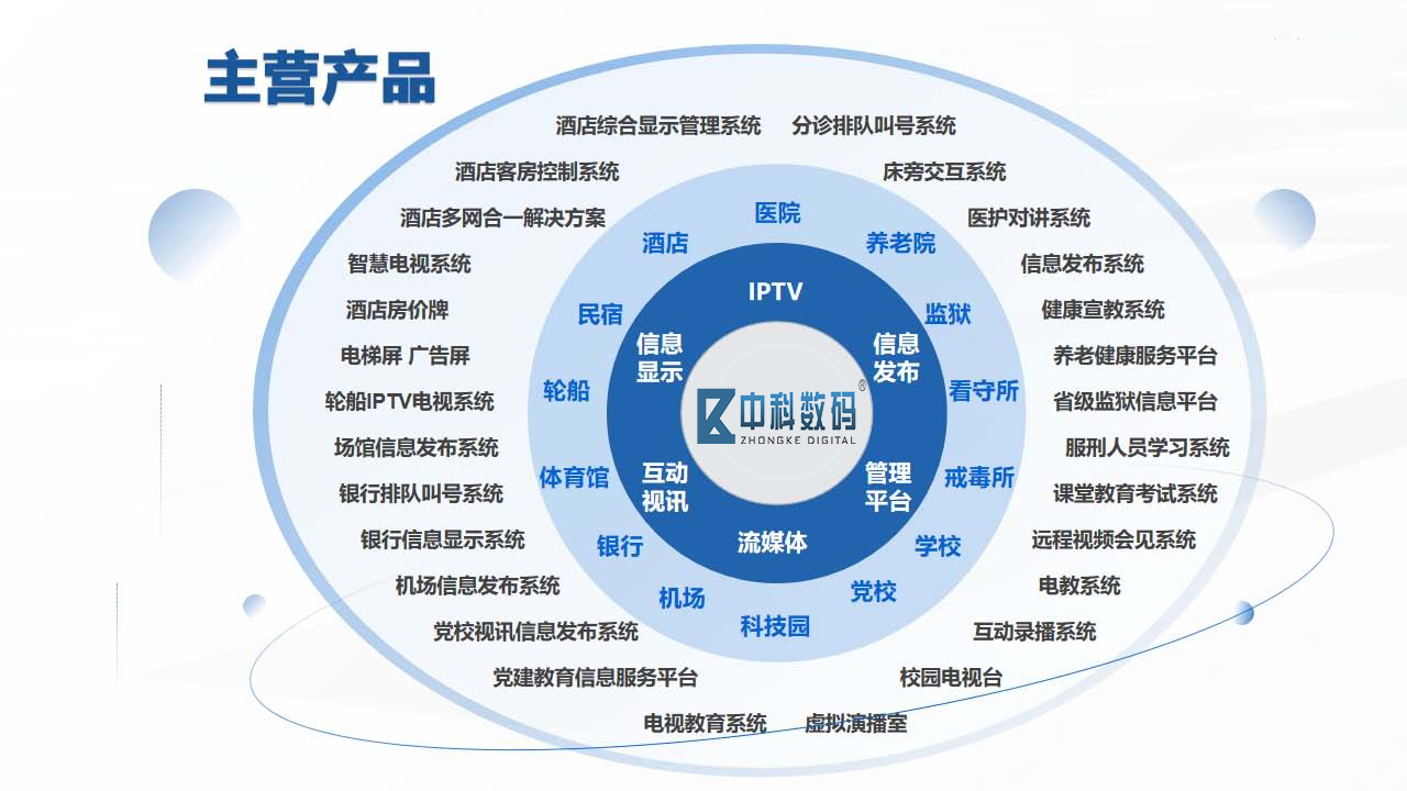 近年来,中科数码在服务于传统广电节目制作、音视频传输的基础上,利用自身技术积累陆续推出了针对政务信息发布、智慧医疗、智慧监所、智慧酒店等等解决方案,结合IPTV、信息发布、AI人脸识别、远程视频通话等功能一体,产品和解决方案在酒店、教育,医疗,监狱、看守所、军队、养老、月子中心等行业被广泛青睐,凭着产品的过硬的品质及良好的服务,得到了业界的肯定,建立良好的口碑。